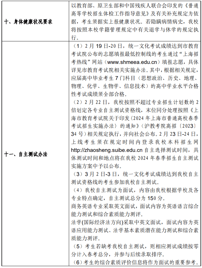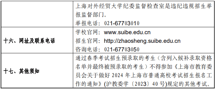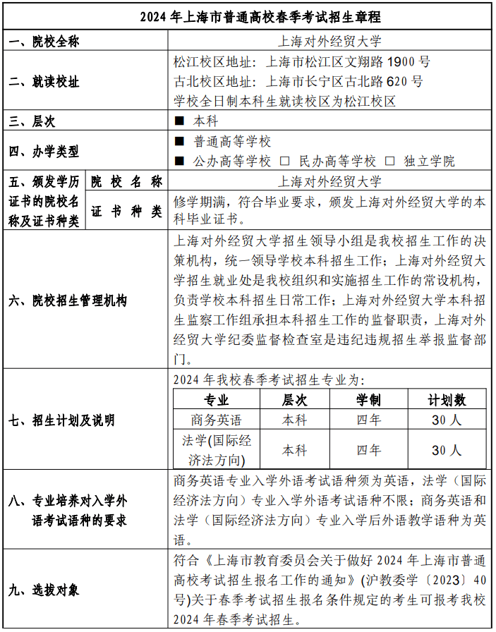 上海对外经贸大学2024年春季高考招生章程